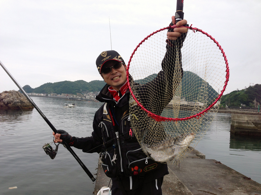 若干のウネリでサラシが大きく、釣りづらい面もあるが、まず遠投で広範囲に探る為にエイジアLCで攻めた。結果、あまり魚の反応がなく、サラシの切れ目や払い出しのカベ等を狙う為、状況に応じエイジアマスターピースやアクロを使用し、魚の反応を見ながら番数を変更した。結果、小型から中型まで散発的にオナガが当たる様になった。永元さんは裏手を攻め、この日最大のクチブトを仕留めた。
