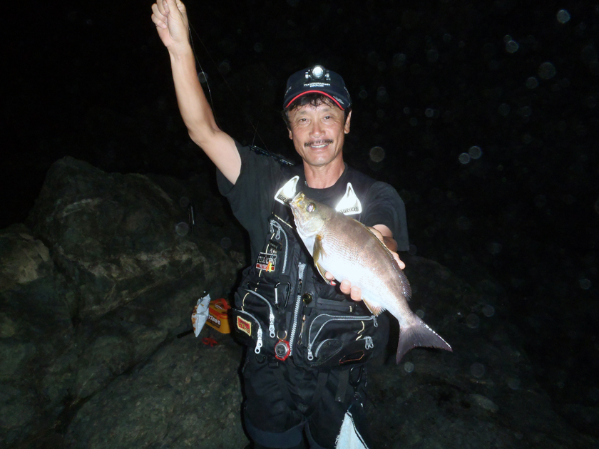 次は、夜釣りです。狙いはイサキ、アジなのですが、沖磯での竿出しならば、釣果も期待出来そうなのですが、地磯、しかも湾内ではどうなることやら… 辺りが完全に暗くなってからの竿出しをしました。ポイントは瀬から竿一本のところ。しばらく撒き餌を打ってから、仕掛けを入れました。ツケエは残った状態で還ってきました。辛抱の釣りを続けていたら、いきなりの当たり。良い竿の曲がりで上がってきたのは、40cm程の両型のイサキでした。やったぜ!