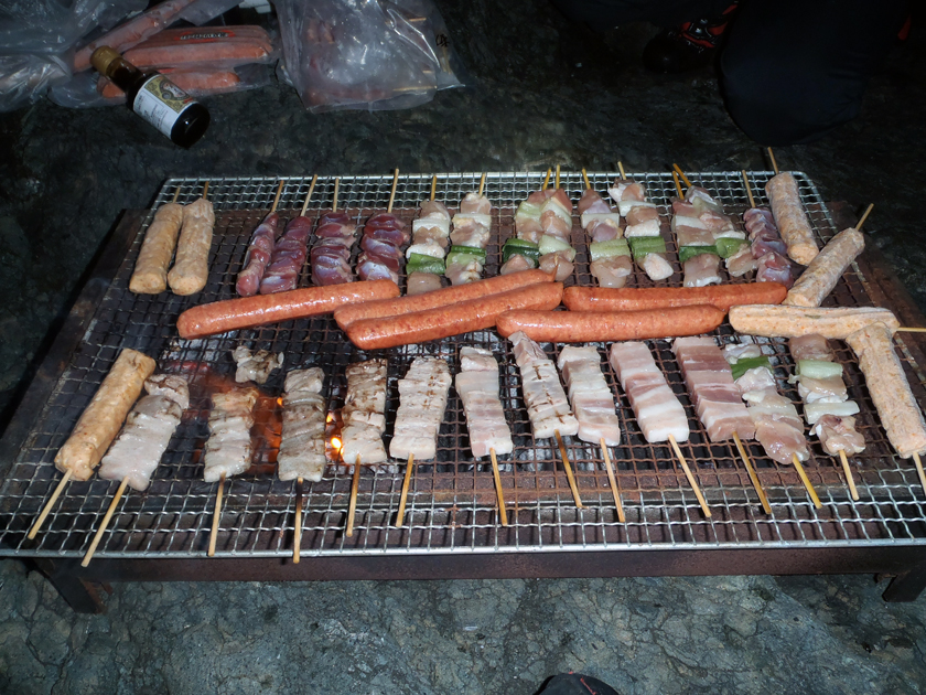 30分ほど休憩をして、再び竿を握った。その数投目、期待のイサキが宙を舞った。しかし、群れが小さいのだろう。再びアジゴの猛攻にあって、意気消沈で夜釣りを終了した。その後。他の4名が合流をしたので、磯焼き肉としゃれ込んだ!気がついたら、東の空が薄明るくなっていた。満天の星空での焼き肉会は、潮風と、波の音、息の合った仲間、最高のひとときを過ごす事が出来ました。やっぱり、釣りは最高!ですね。