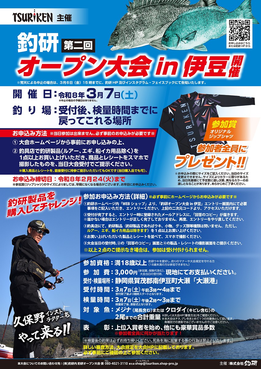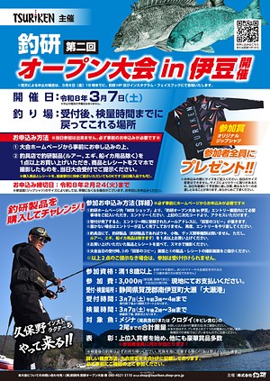 この度、満18才以上であればどなたでも参加可能な「釣研第二回オープン大会in伊豆」を来年3月7日に開催します。豪華景品はもちろん、大会に参加された方には参加賞として、オリジナルジップシャツをプレゼントいたします!
